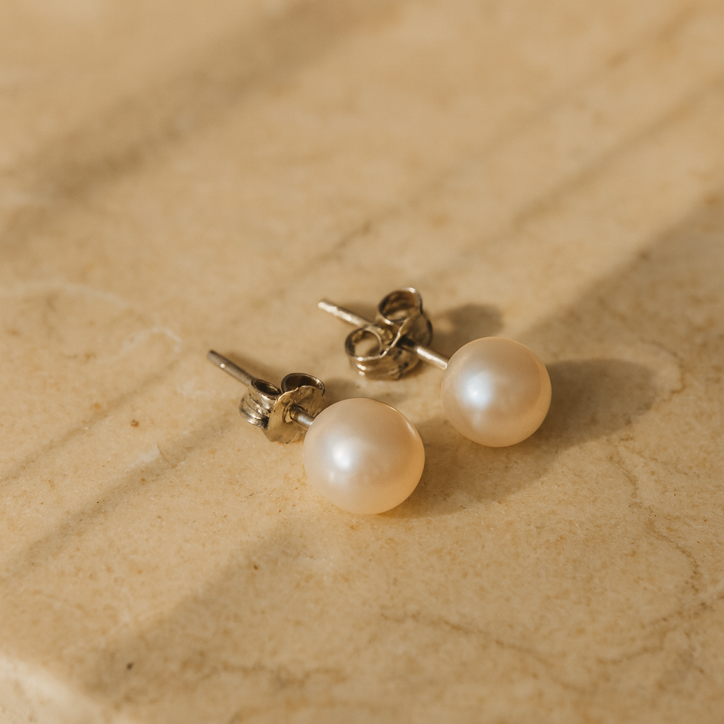 Aritos de plata esterlina con perlas naturales de río. Sutiles y luminosos, evocan la pureza del agua en movimiento.